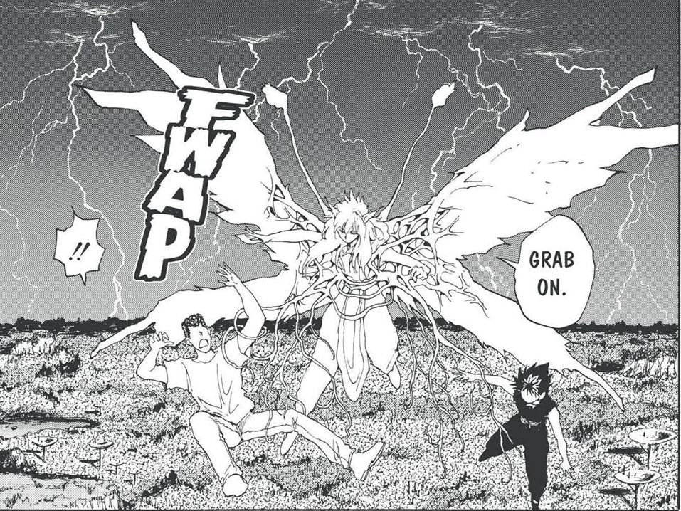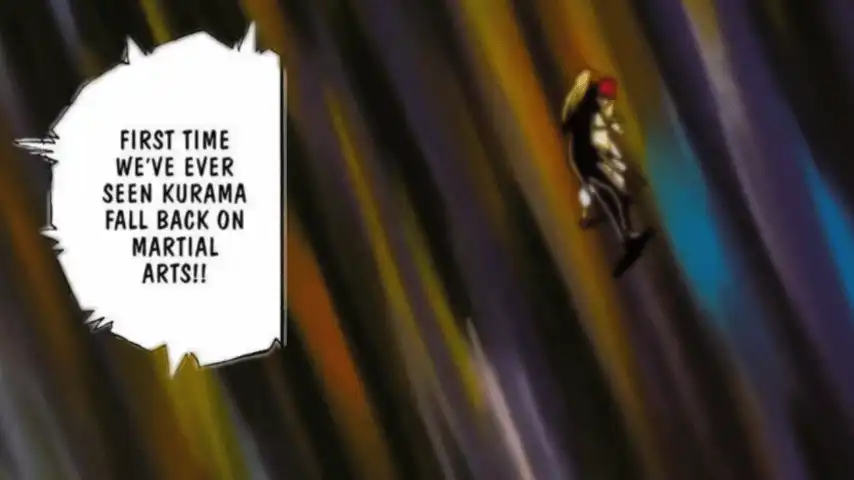 “But wait” you might be thinking, “what about the multipliers? Wouldn’t they affect the speed gap?”. That’s another good question. Let’s start with the most notable one. Off the bat, Sensui’s is already odd to use, and blatantly does not apply to speed in our opinion. In the very scene he describes himself as having 10x more aura than Yusuke, he also says that Yusuke is faster and stronger than him. In a later fight, Yusuke charges a spirit gun that outright blitzes him (seriously, he’s looking at it coming like a deer in headlights). So no, Sensui’s multiplier does not help Kurama here. But what about TP? It falls under a similar problem. While it is true that Yoko has around 17x to 80x the amount of TP that base Kurama does, it’s important to remember that TP means TOTAL POWER. It is a videogame-y system that measures Hit Points, Offensive Power, Defensive Power and Special Power. It is completely unknown what fraction of this number is supposed to represent speed, and as such we’re not assuming anything substantial from it. Yoko drastically increasing Kurama’s speed is also unsubstantiated by the fact that base Kurama is able to dodge and tag Karasu, who was able to dodge and avoid Yoko’s plants just fine.