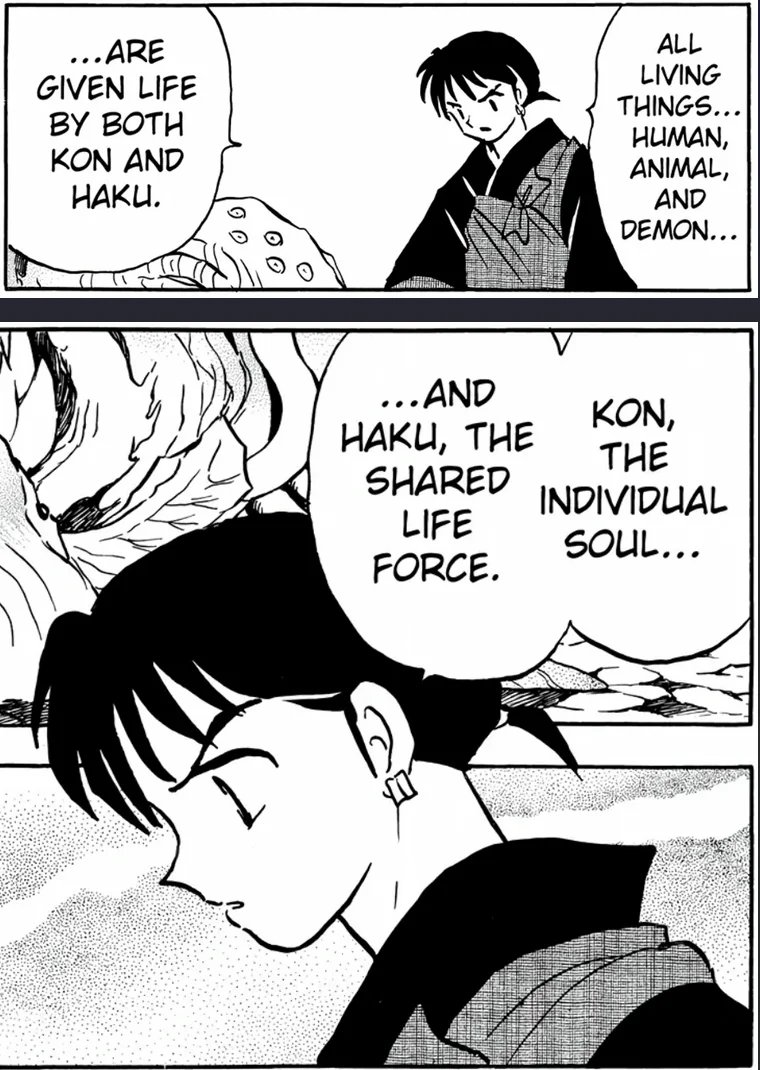In the end, Inuyasha had everything that mattered, friends, family and somewhere he could call home, in contrast to Naraku. And gave an end to suffering, no more magic pearls which could make everyone fight for them, but he’d never do this without love, love that transcended time. Along the way, he came to understand that true strength was never in becoming a full yōkai, but in bearing the weight of his own fang as he was, neither fully yōkai nor human, and using that to protect those he cared for. He kept fighting not as one or the other, but as himself: the father of Shihanyō Moroha, whom he would swear to protect, even if it took an eternity.