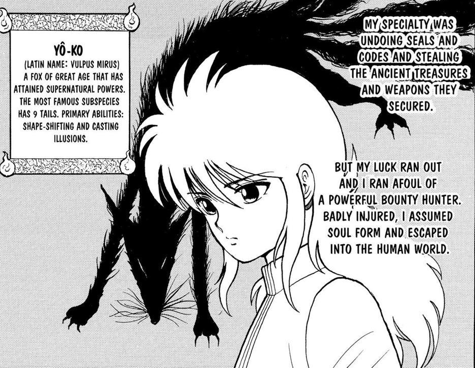 Yoko Kurama is very directly based on the Kitsune (狐, fox), one of Japan’s most popular yōkai. Being a fox yōkai occupying the body of a young boy, when Kurama reveals his true form, you’ll see a towering silver-haired wolf man.